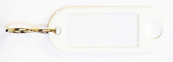 Nyckelbricka i plast med etiketthållare. Försedd med fönster och etikett och S-krok. Bricka: 54x21mm, etikett: 32x14mm.