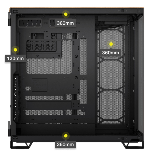 • Bred kylflexibilitet: Anpassa din kylinställning med plats för upp till 10x 120 mm eller 7x 140 mm fläktar, inklusive mångsidiga alternativ för radiatormontering för upp till 360 mm i taket, botten och sidan.