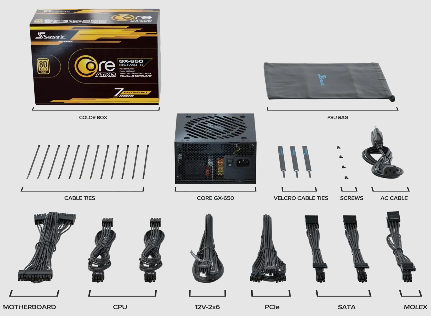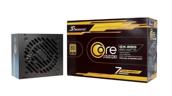 The updated Seasonic CORE GX ATX3 series complies with the latest ATX 3.1 and PCIe 5.1 standards and includes four output ranges from 1000W to 650W in both black and white colors. Catering to a broad spectrum of PC enthusiasts and system builders, these power supplies provide a fine balance between cost and performance.?The 80 PLUS®?Gold certified Seasonic’s Core GX line is a fully modular design equipped with black cables featuring a braided pattern. These power supplies are solid performers for a large range of applications, where a 120 mm Hydro Dynamic Bearing fan is combined with Seasonic’s Smart and Silent Fan Control to ensure the optimal cooling performance at the lowest possible noise level. These quality power supplies are backed up by Sea Sonic’s 7-year worldwide manufacturer’s warranty.