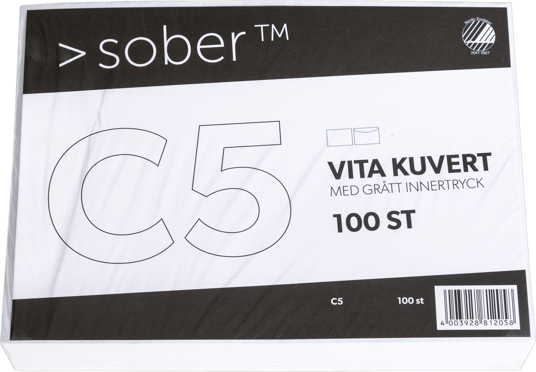 Vitt standardkuvert med grått innertryck och remsa. C5. 162x229mm. Kommer i förpackningar om 100ex. Svanenmärkt.