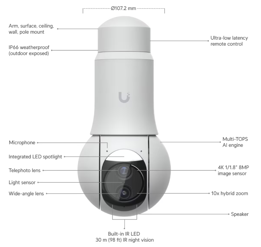 All-weather, 4K dual-lens camera with 10x hybrid zoom, 1/1.8" 8MP image sensor, Multi-TOPS AI Engine, and ultra-low latency pan-tilt-zoom control for motion tracking.
