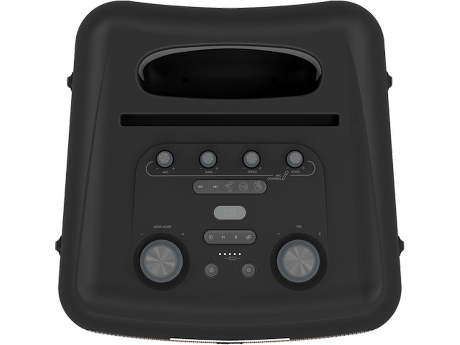 För det lägre frekvensområdet spelar dubbla 8" element, med ett frekvensomfång som sträcker sig ner till 35 Hz. Genom att addera en inbyggd RGB-ljusshow så är högtalaren ett komplett nöjespaket för både musikälskare och festfixare. Upp till 18 timmars batteritid, instrument- och mikrofoningångar, DJ-effekter och appstyrning gör den till en flexibel lösning för allt från karaoke till spontana hemmarave. Det IPX4-certifierade kabinettet ger en stänksäker design.