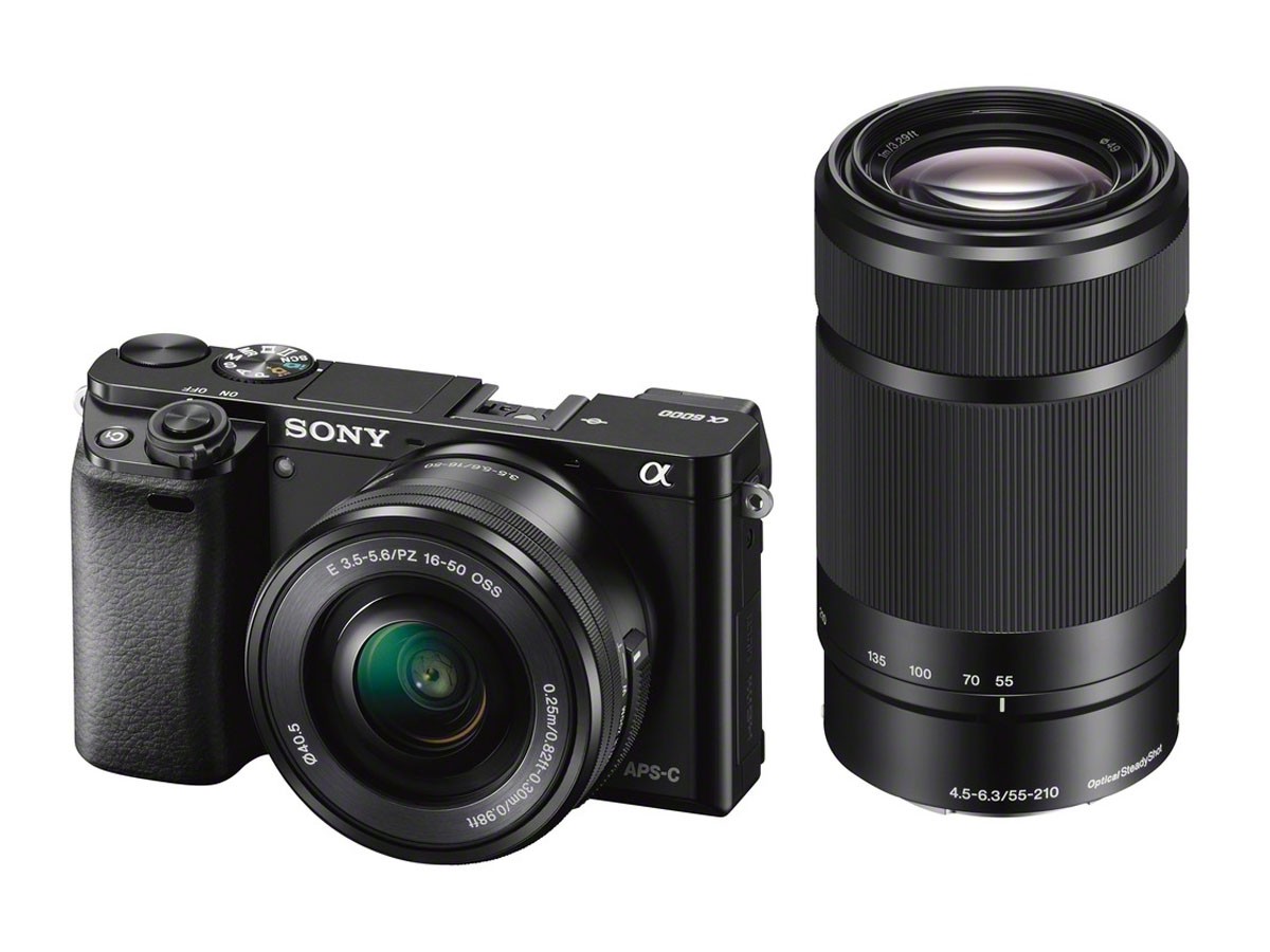 Sony A6000 med E 16-50/3,5-5,6 PZ OSS, E 55-210/4,5-6,3, nätsladd, nätadapter, laddningsbart batteri (NP-FW50), axelrem, kamerahuslock, okularlock, mikro-USB-kabel.