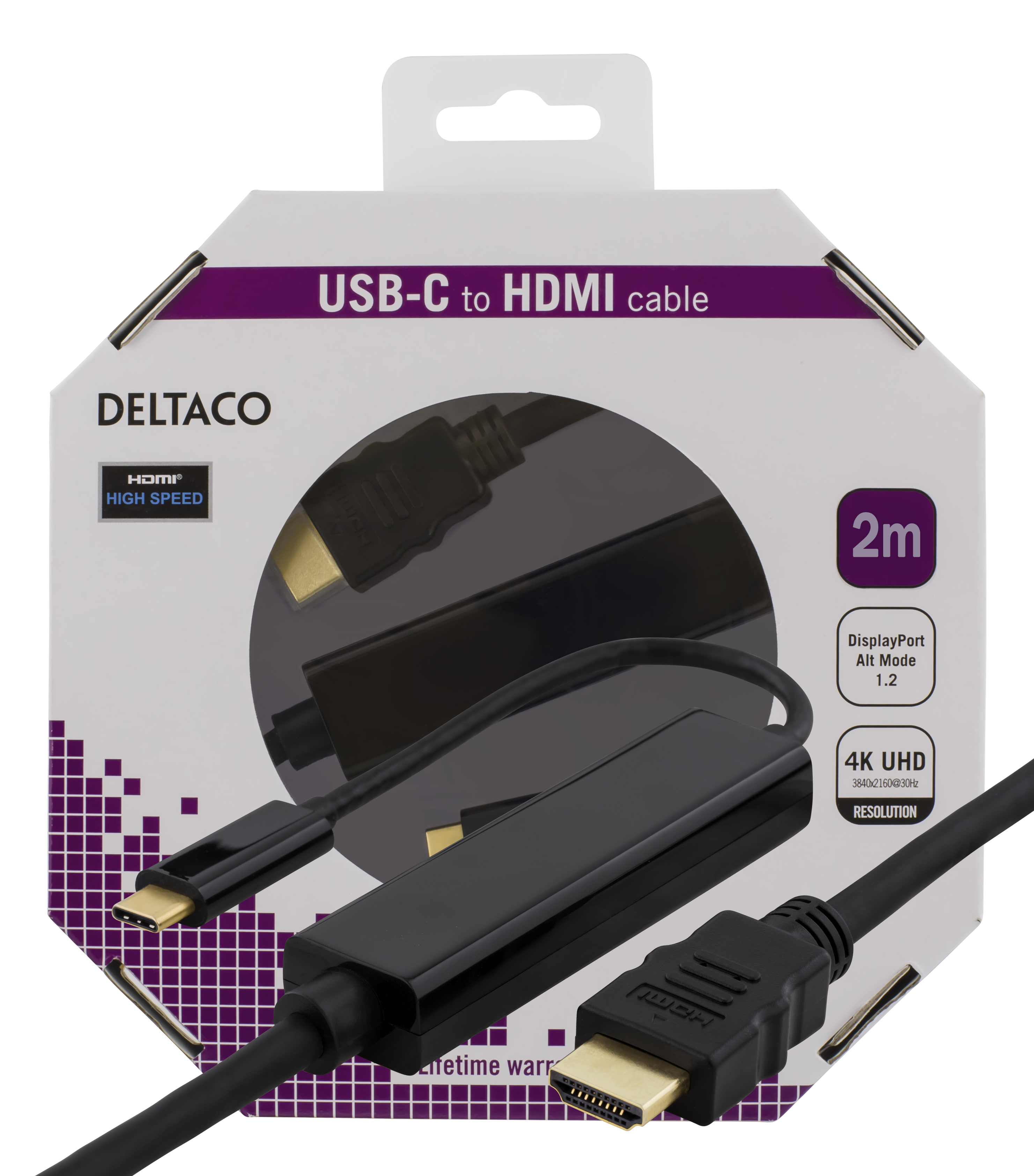 Deltaco USB-C - HDMI, Ultra HD 3840x2160 30Hz, 2m, svart