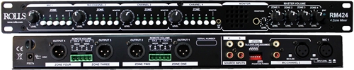 RM424 Fyra Zoners Mixer kombinerar två mikrofoner med två line-level inputs. Varje input är valbar att skicka till vilken kombination av utgångar du själv vill av de fyra zonerna. Alla outputs är balanserade XLR-kontakter, Fjärrkontrollmöjlighet till varje separat zon. Med hjälp av de smidiga zonknapparna på framsidan kan du väldigt enkelt peka ljudet till rätt zon för varje kanal. RM424 är väldigt enkel att använda även om du saknar erfarenhet av ljud.