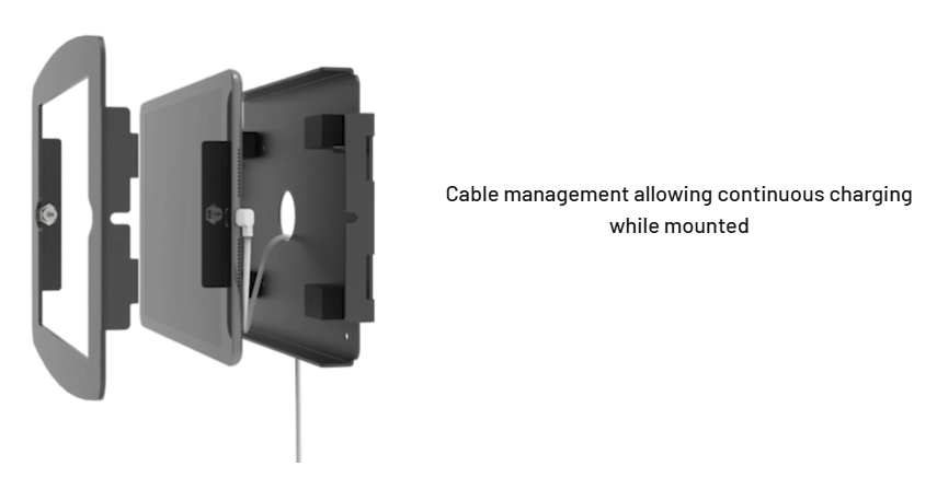 The Space iPad Enclosure boasts rounded edges and open corners, enhancing ventilation and allowing limited access to buttons and inputs. Like all our tablet designs, the iPad can be continuously charged while enclosed, and peripheral cables can remain plugged in while mounted. You can mount this iPad enclosure flush to the wall or surface using the standard VESA pattern, or pair it with one of our stands for added functionality. This wall mount is designed to offer flexibility, making it suitable for any workspace. Additionally, it is compatible with our T-bar cable locks, ensuring maximum security in high-traffic environments.