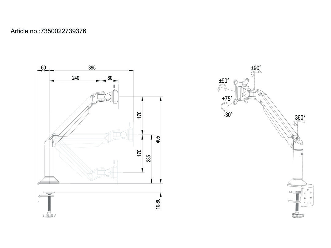 Supports VESA standards 75x75 and 100x100 and holds screens weighing from minimum 2kg and up to maximum 10kg. This interval is important to keep due to the gas driven piston that keeps your screen floating in the air.
