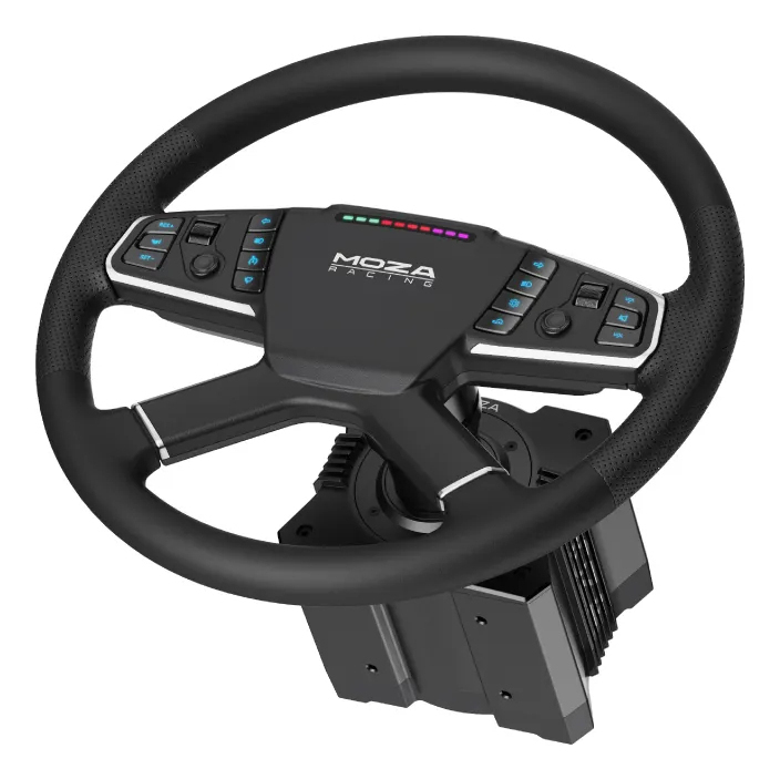 Discover the MOZA TSW Truck Wheel, engineered for an unparalleled truck simulation experience. With its classic four-spoke design and standard 400mm diameter, this wheel brings the authenticity of a truck’s control into your hands. The rim, wrapped in hand-stitched microfiber leather, offers a blend of comfort and grip, while the aerospace-grade aluminum frame guarantees long-term durability. Equipped with customizable RGB buttons and LED lights, it allows for extensive personalization. Compatibility with all MOZA bases, as well as third-party systems through a universal adapter, ensures a seamless fit into any setup. Enhanced by its high-strength steel construction and versatile adjustment options, the MOZA TSW Truck Wheel is the definitive choice for simulation enthusiasts seeking depth, functionality, and an immersive driving experience.