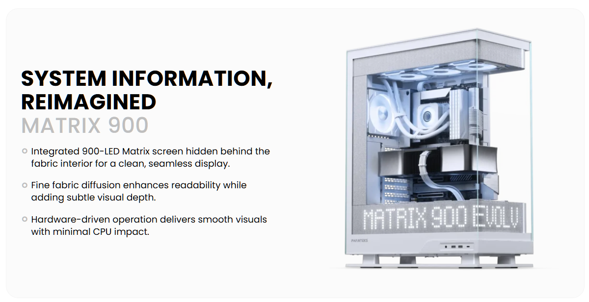 The Evolv X2 Matrix introduces a bold new dimension to the Evolv series with its integrated 900-LED Matrix Display, hidden behind the refined fabric interior. This unique feature transforms the chassis into a dynamic canvas, bringing personalized lighting and visual effects directly into your build.